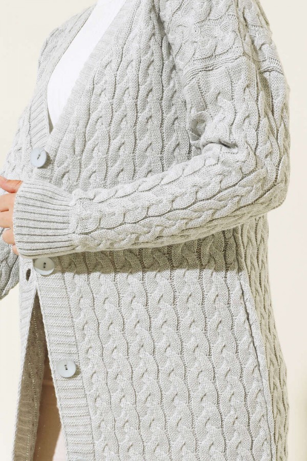 - Yeni sezon uzun triko hırkamız saç örgüleriyle şık bir görünüm sunmaktadır. Boydan beş düğmeli olan triko hırka düşük omuz modeliyle salaş bir kombin yapmanıza olanak sağlayacaktır.